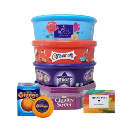 Pack of 4 includes Mars Celebrations Chocolate Bar Tubs (1.21 Pound), Nestle Quality Street (600g), Cadbury Heroes Tin (800g), and Cadbury Roses Tub (550g)
