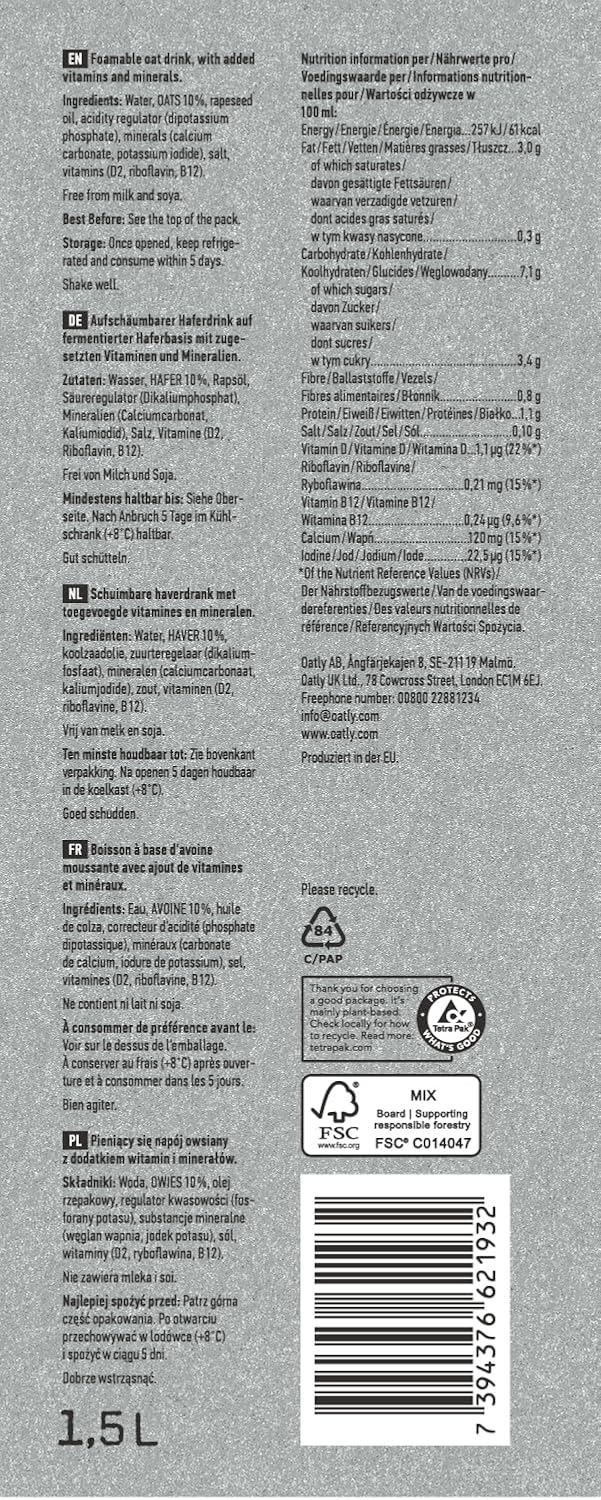 Water, OATS 10 %, rapeseed oil, acidity regulator (dipotassium phosphate), minerals (calcium carbonate, potassium iodide), salt, vitamins (D2, riboflavin and B12).
